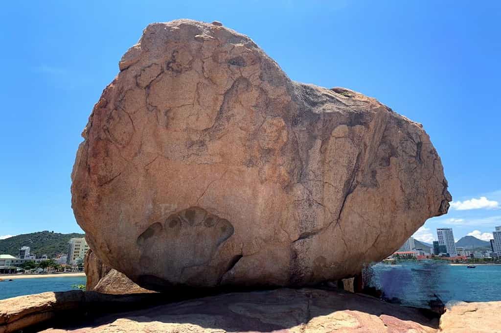 Nằm trên mỏm đá cao nhất của Hòn Chồng là một khối đá vuông vức to lớn. Và điều kì lạ là trên mặt của tảng đá hướng về phía biển có in dấu 1 bàn tay khổng lồ hằn sâu trong đá. Nó được gọi là hình bàn tay vì nó có đầy đủ cả lòng bàn tay và 5 ngón tay.